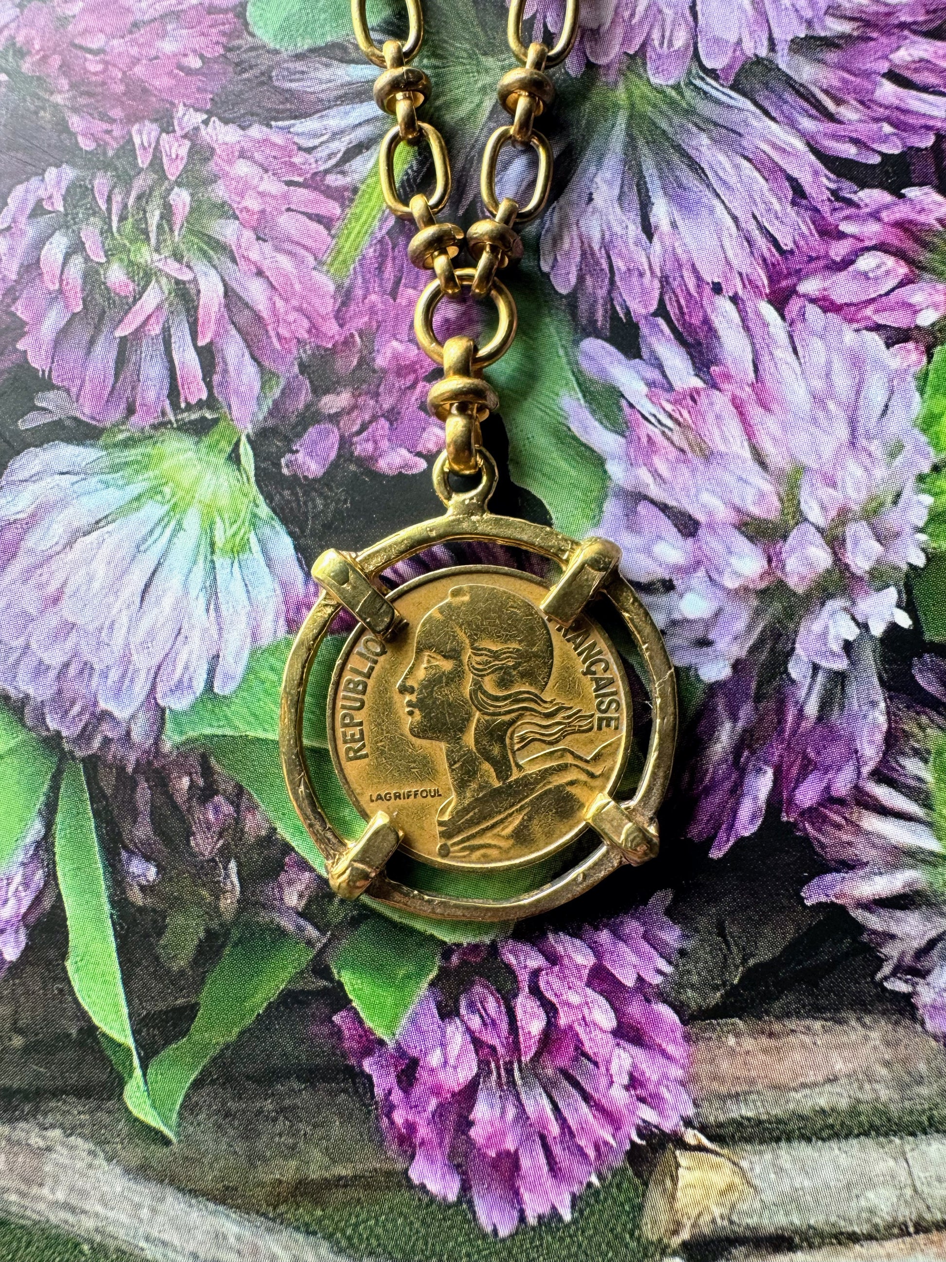 This vintage coin necklace features a 1963 République Française medallion in a soft gold tone, offering that just-right mix of history and edge. Set on a 12.25” chain with a slim 1.25” pendant width, it layers beautifully with other pieces or stands alone as a statement. The coin itself adds a subtle nod to French heritage with classic profile detailing and crisp lettering.