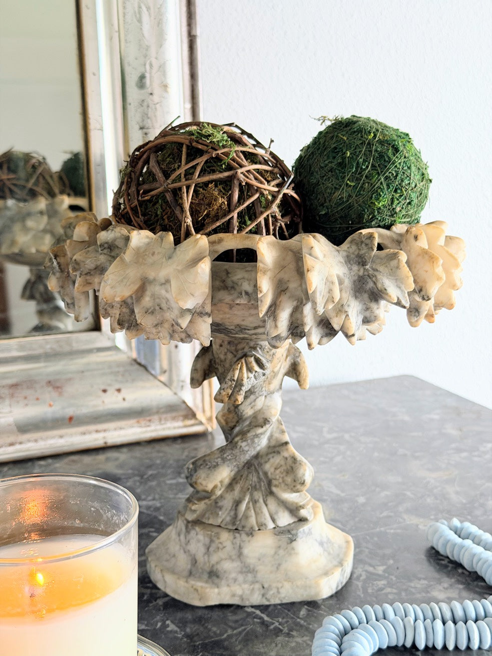 Hand-sourced in Europe, this antique alabaster tazza is carved from beautifully veined stone with soft variation throughout the surface. The bowl is adorned with carved leaves that drape around the rim, resting on a sculptural pedestal base.