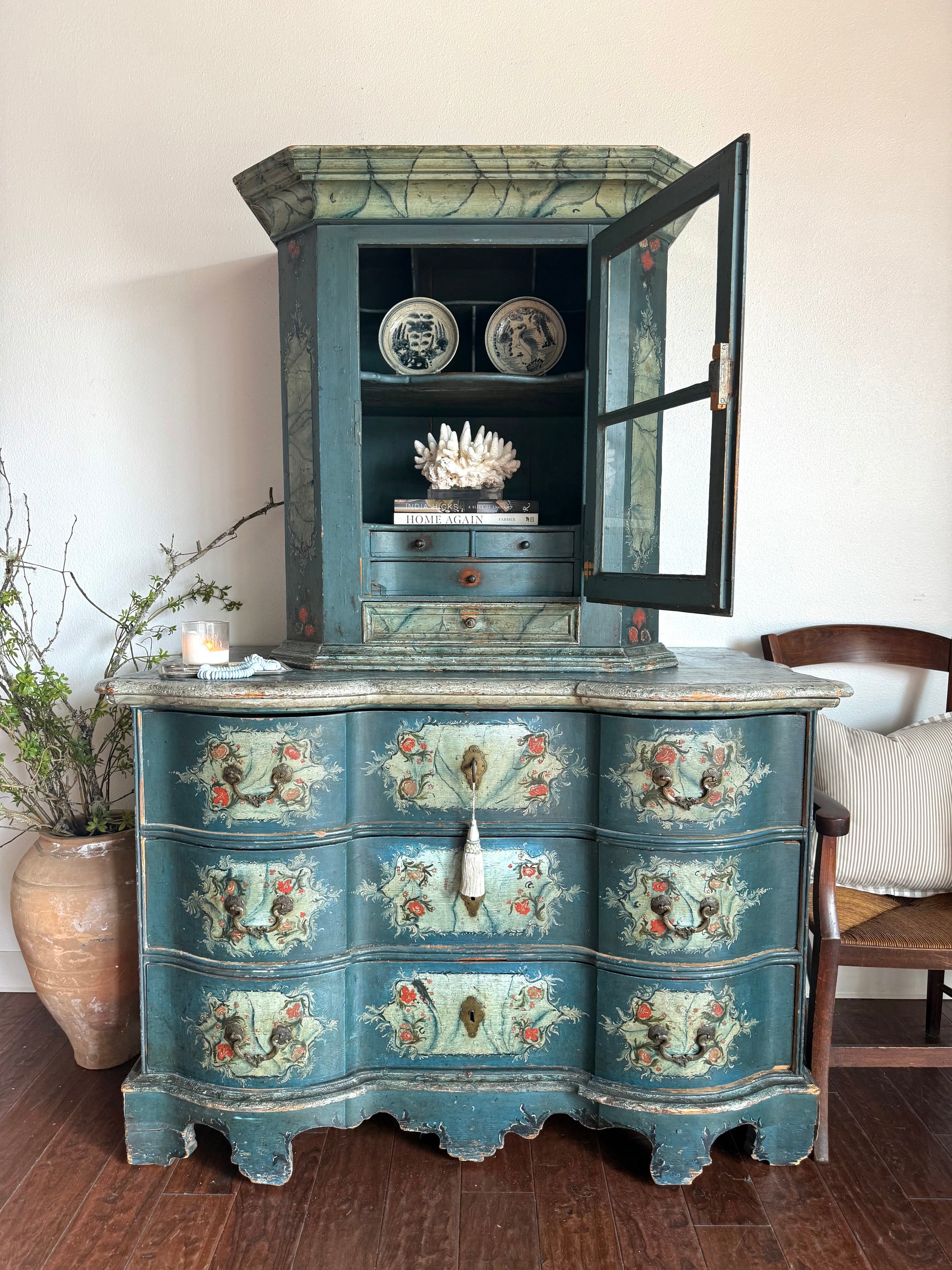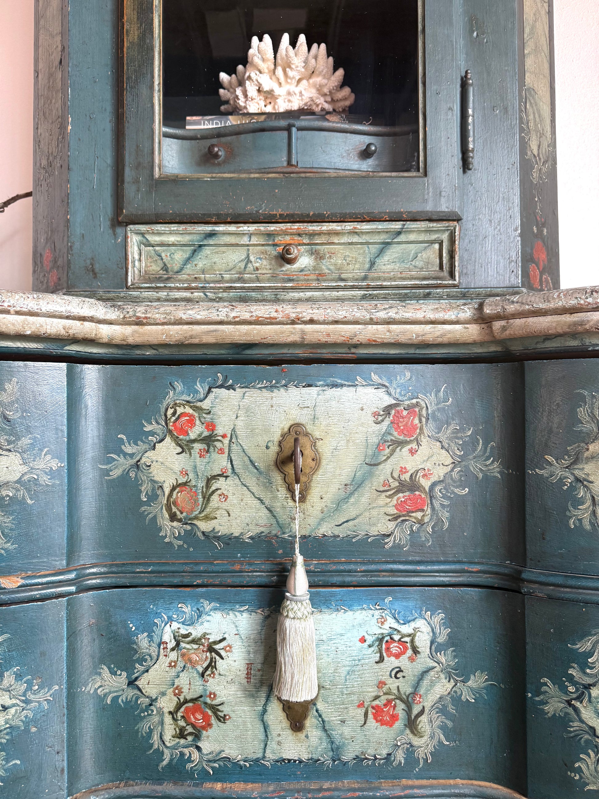 The lower base would have originally been used to store clothing or household linens, while the upper cabinet or vitrine displayed heirlooms, ceramics, or devotional objects. Pieces like this were sometimes created as marriage or dowry gifts, blending function with symbolism and serving as an important anchor within the home. Her serpentine silhouette nods to Baroque influence, interpreted through an Alpine lens that feels warm, storied, and grounded.