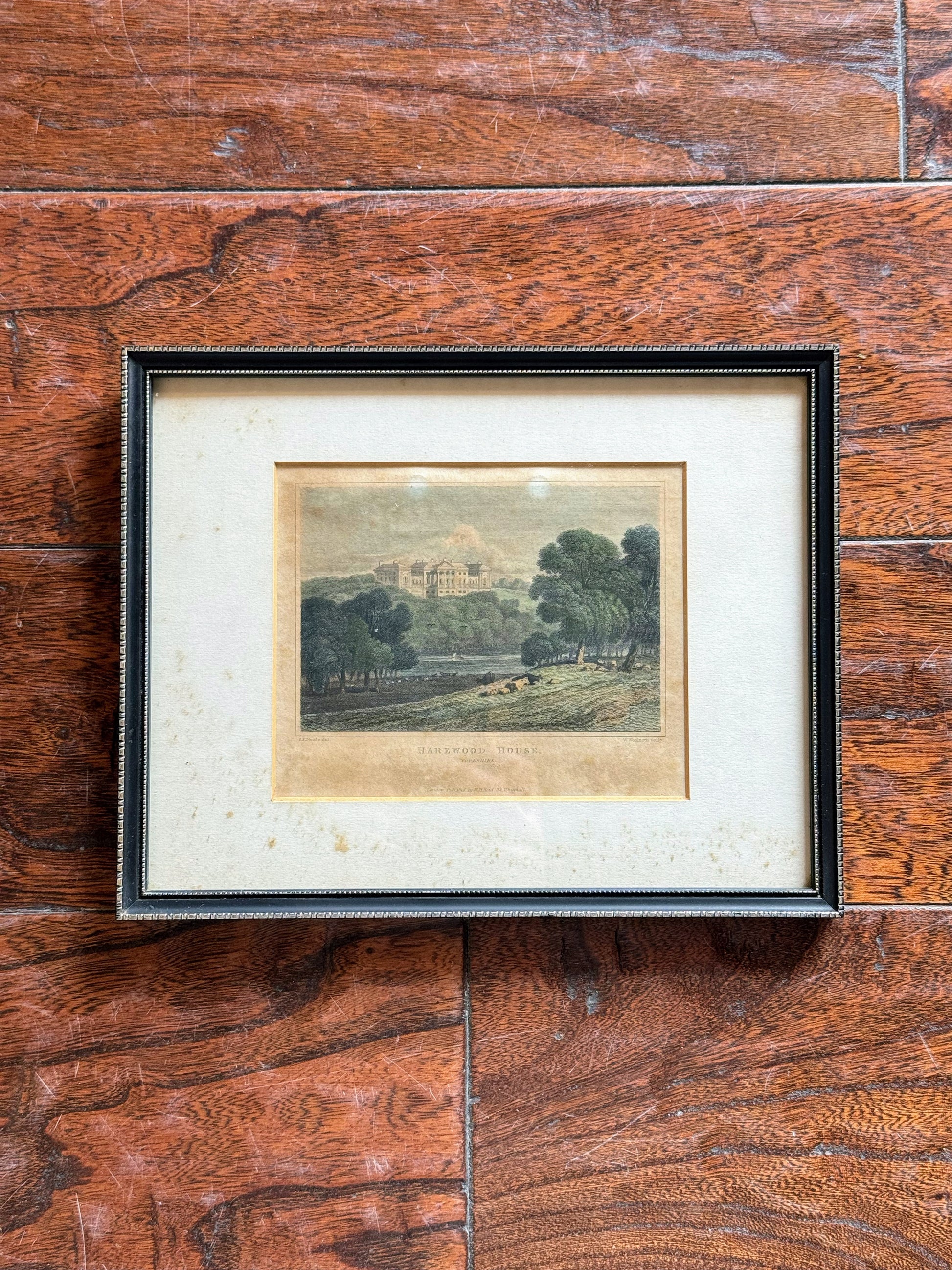 The estate is surrounded by open grounds and tree-lined paths, capturing the elegance and grandeur of historic English properties. The print is mounted under glass and housed in a simple wood frame with a warm finish that complements the traditional subject.