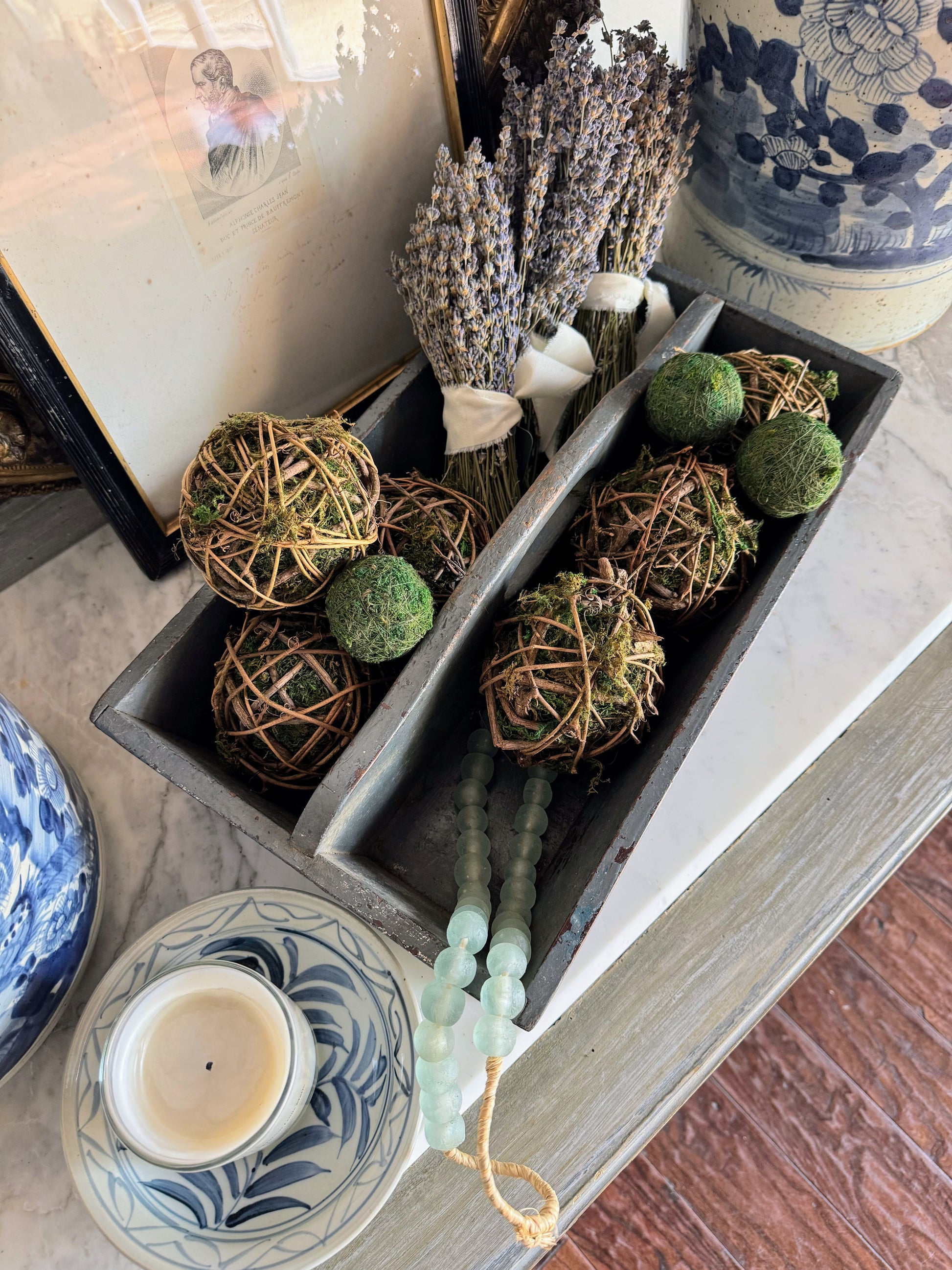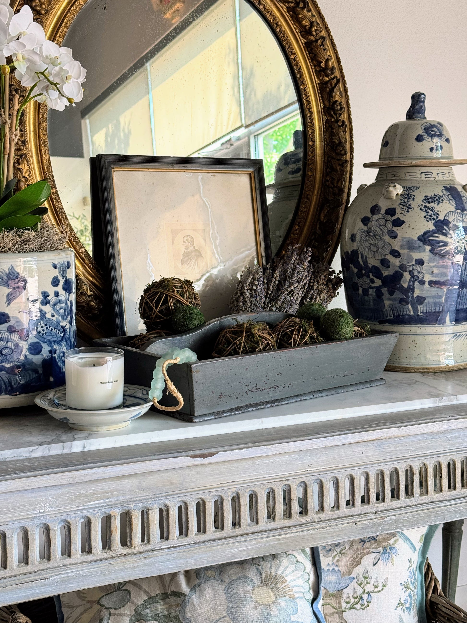 Today, it offers all that old-world utility with a charming patina from years of real use. The painted finish adds a soft, worn character that feels lived-in and layered — perfect for styling on a kitchen counter, shelving, or even a sideboard. You could still use it for utensils, but it also makes a great spot for napkins, herbs, or pantry staples in jars.