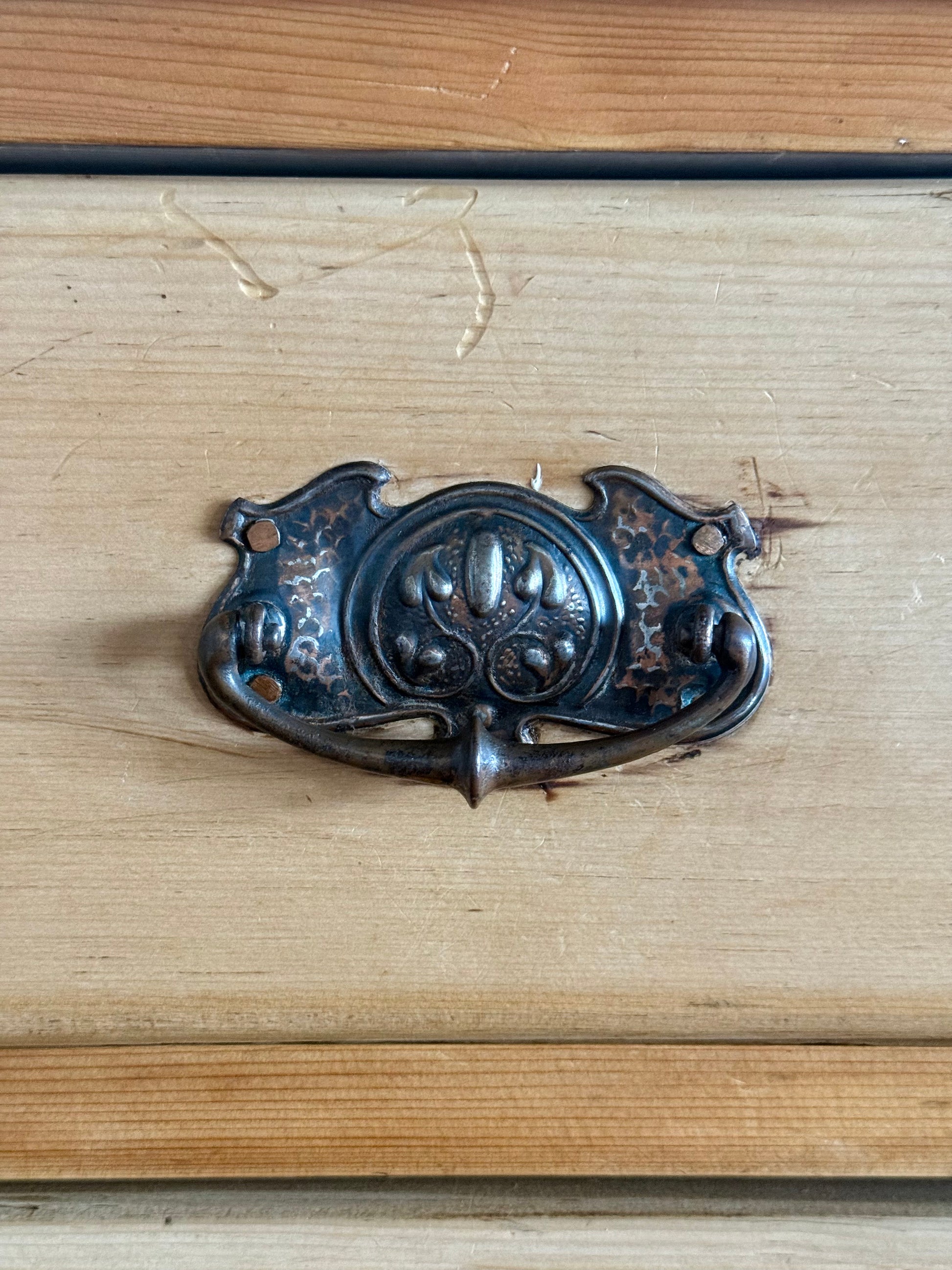 Good antique condition with age-appropriate wear, marks, and tonal variation to the pine consistent with use and time. Hardware shows natural patina. One minor chip in the corner of the bottom drawer, as photographed.