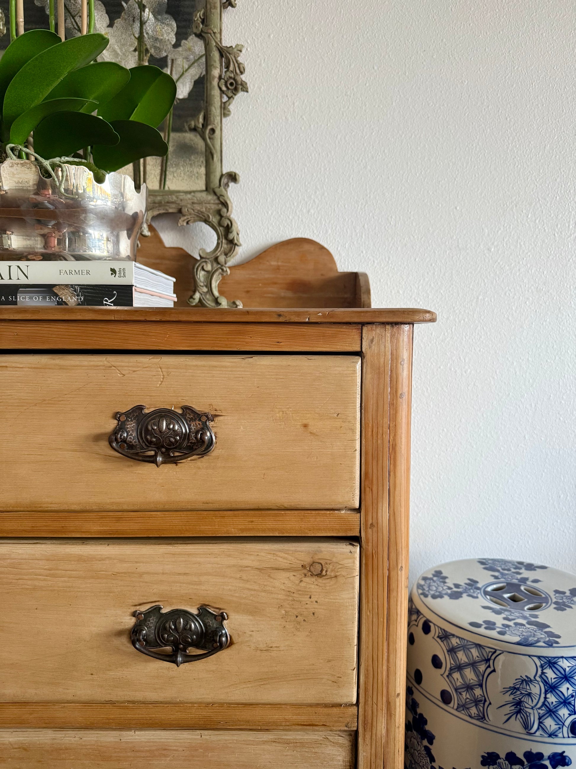 She would be beautiful in a bedroom for folded textiles, in an entry topped with a mirror and collected objects, or tucked beneath artwork where her light pine tone adds warmth without heaviness. An English staple that brings softness and practicality to a space.