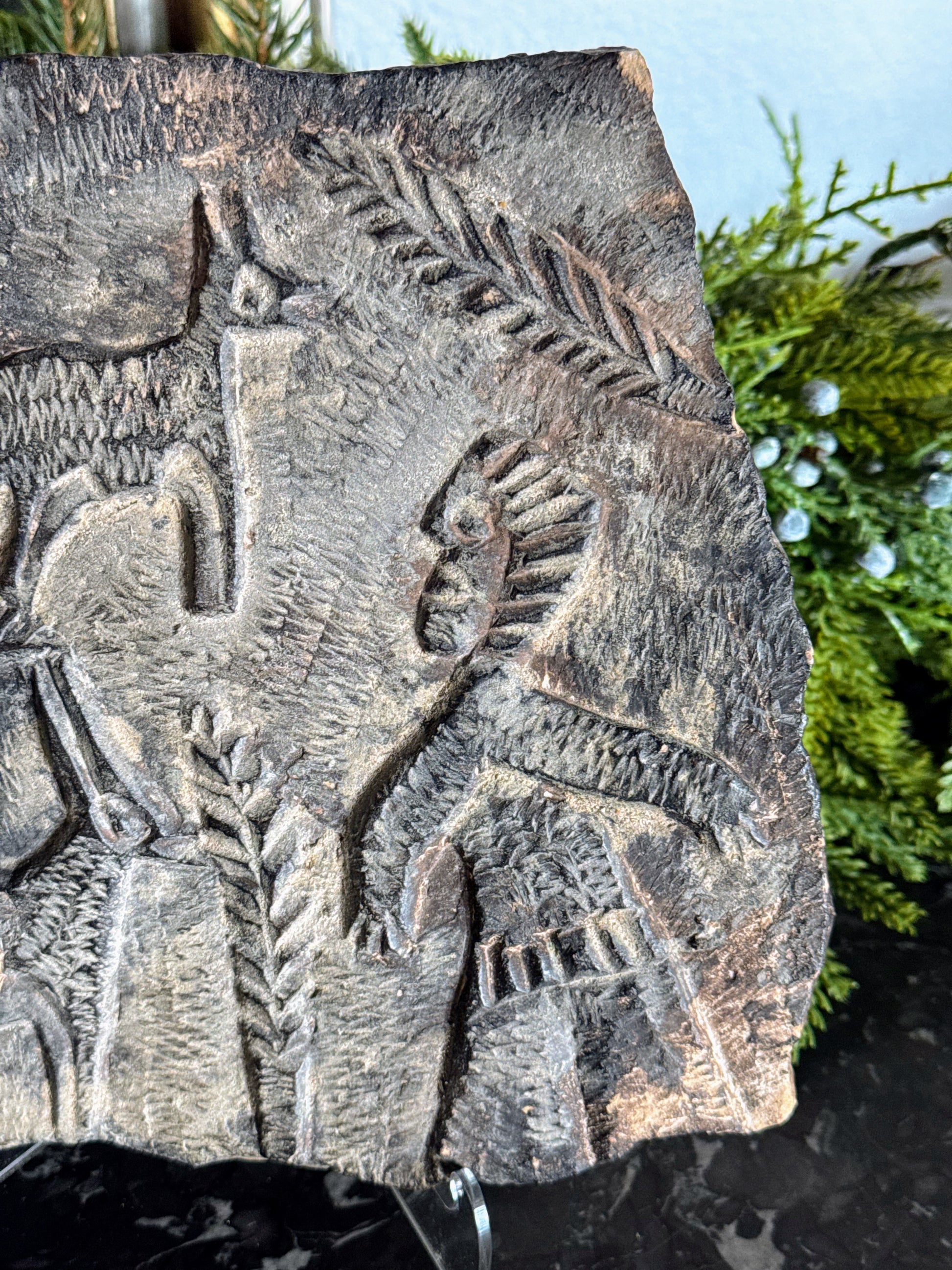 The imagery is bold and expressive, featuring animal and figure motifs surrounded by leafy, hand-carved patterns. It feels ancient in spirit, full of texture and story.