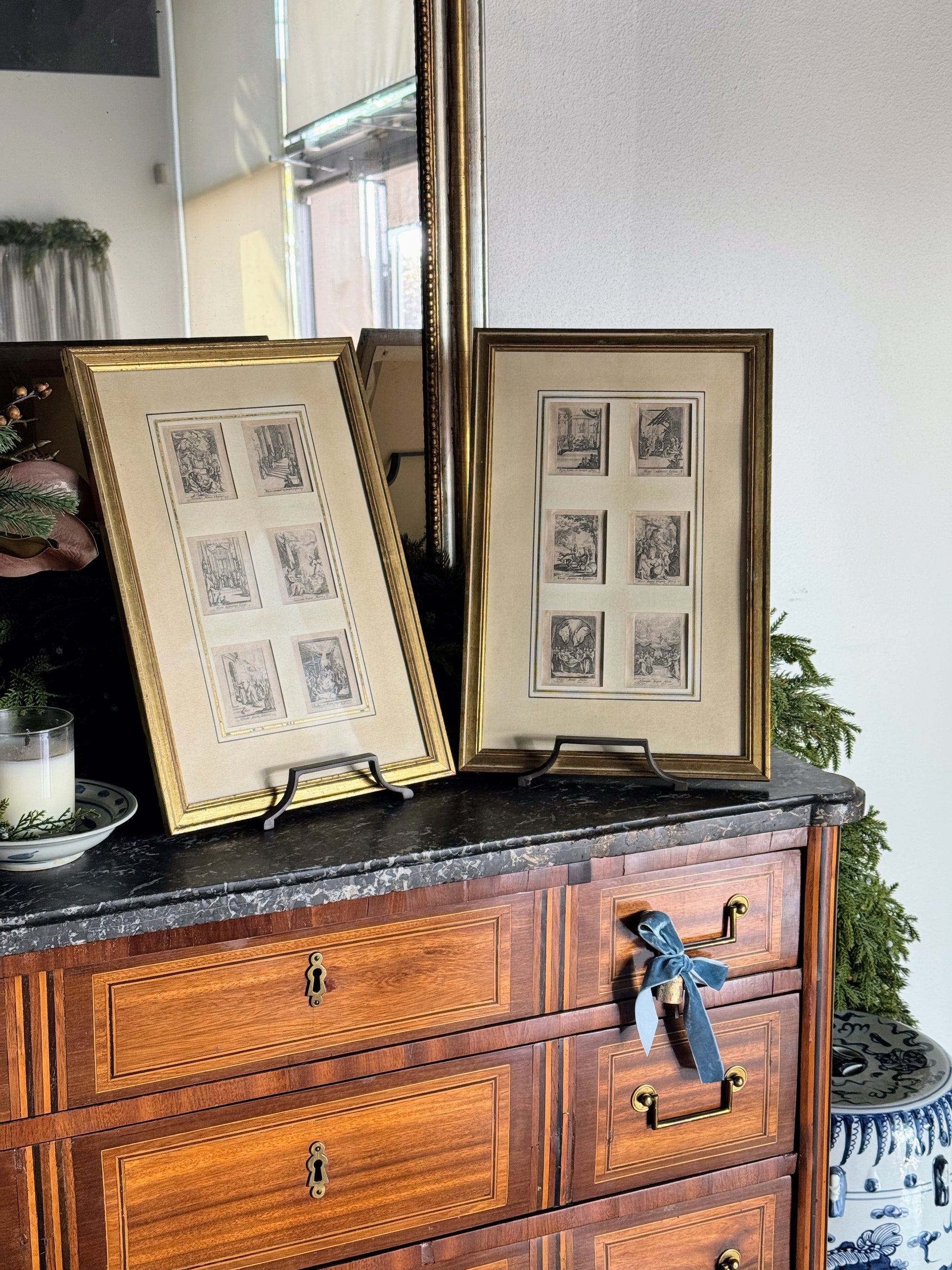 Both pieces are set in classic gilt frames with soft aging and a layered mat that gives each miniature print room to breathe. The overall palette is muted and warm, the paper carrying just enough patina to remind you of their age without feeling overly worn. Side by side, they read as a thoughtfully curated pair; individually, each one holds its own.