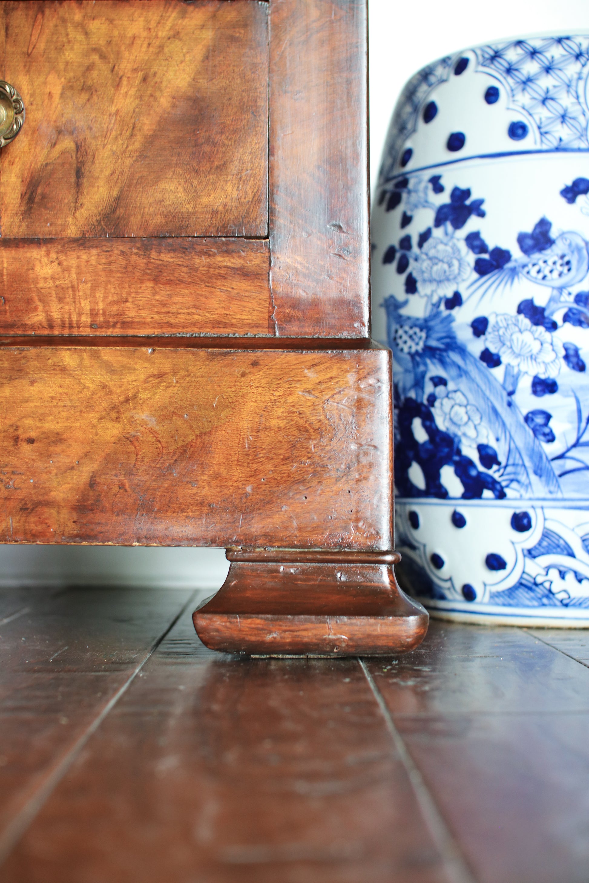 It features four drawers with turned brass knobs and classic Louis Philippe lines—clean, slightly curved, and substantial without feeling heavy. The figuring continues across the top and sides, which is always something we look for, and the tone has that warm, mid-depth brown that pairs easily with both lighter and deeper palettes. Solid construction throughout, with drawers that open and close well.