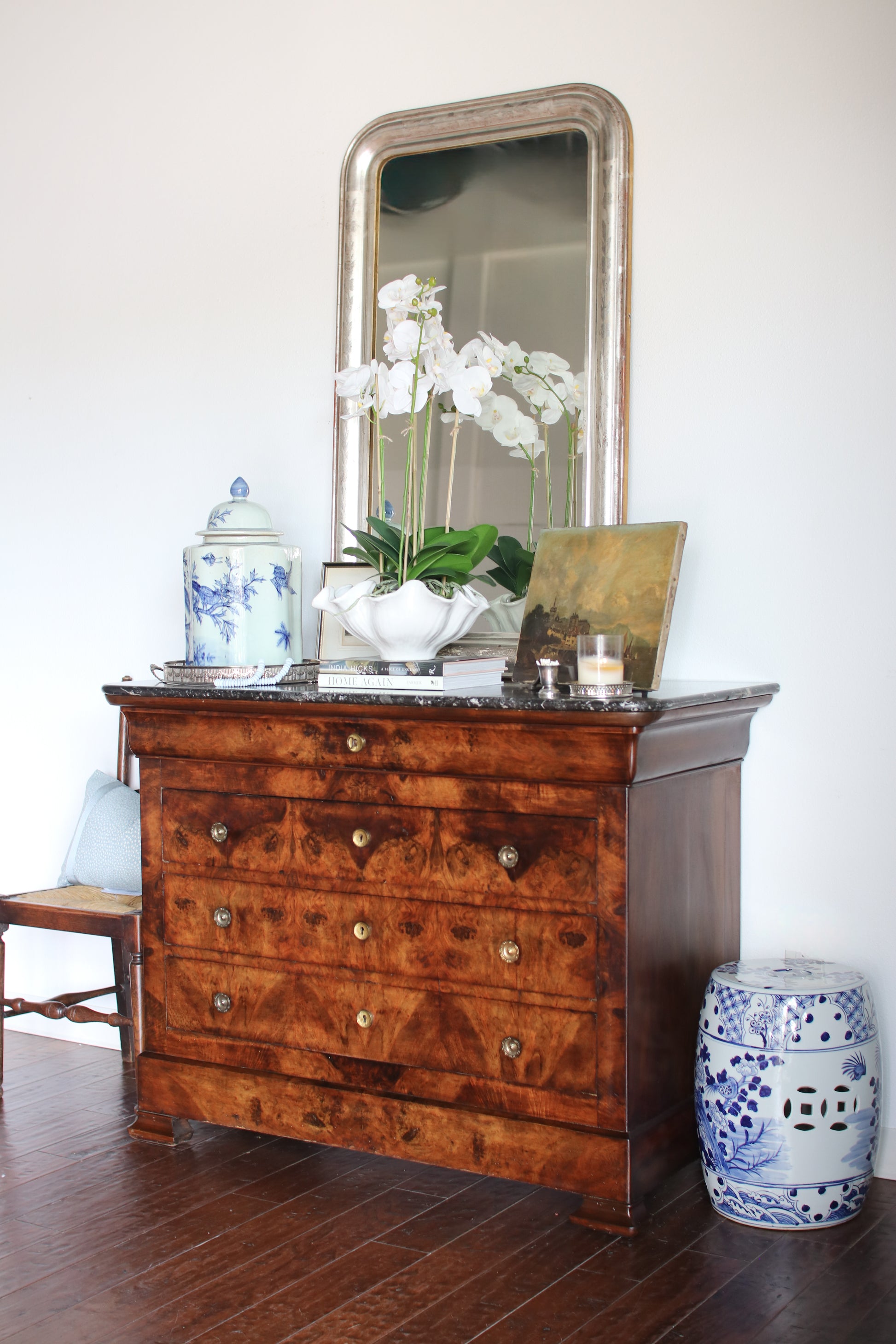Hand-sourced in France, this Louis Philippe commode is a beautiful example of 19th-century craftsmanship, with richly figured flame mahogany that immediately draws you in. The movement across the drawer fronts is especially striking—each panel slightly different, creating that layered, almost painterly effect these pieces are known for.