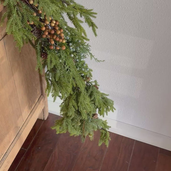 This garland is a true labor of love — I designed and hand-tied each strand with care over the course of two months. Built on a full, natural-looking base of pine and fir, each section is layered with hand-selected juniper berries, pinecones, and textural sprigs, placed with intention to feel organic and festive.