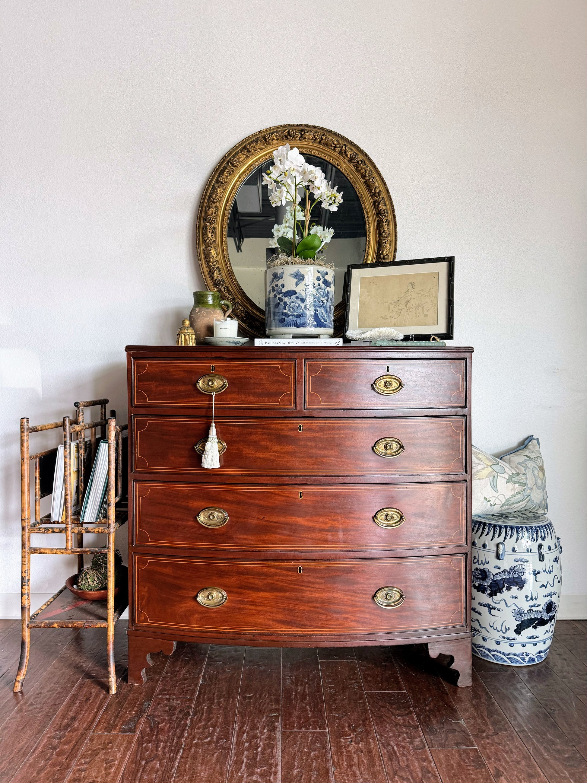 This English mahogany bowfront chest features a classic two-over-three drawer layout and a beautifully curved front that gives it a soft, elegant shape. Each drawer is outlined with fine string inlay, adding subtle definition without overwhelming the clean lines of the piece. The inlay work is especially lovely—simple, precise, and consistent across all five drawers, highlighting the quality craftsmanship.