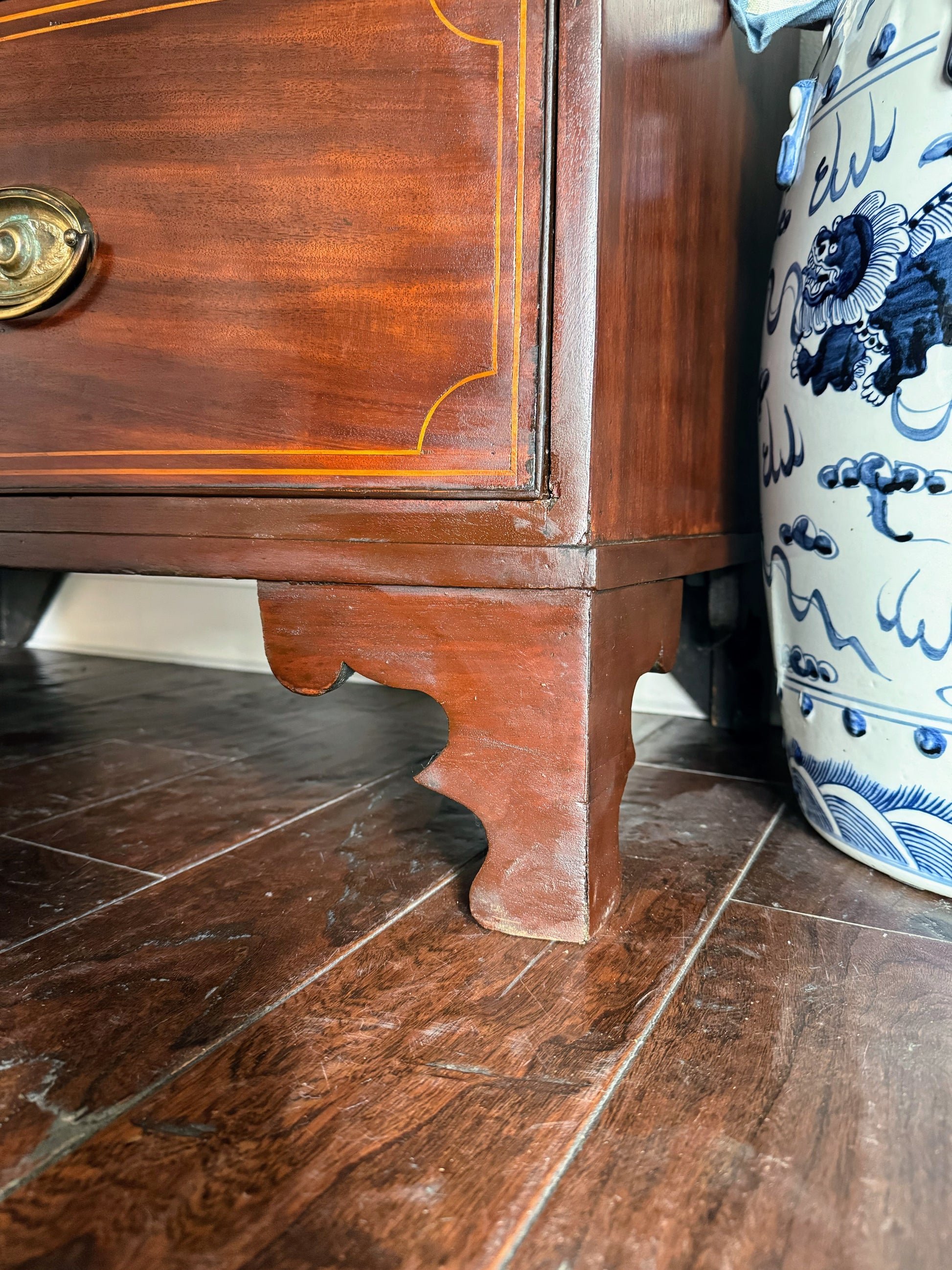 The warm mahogany has aged beautifully, showing off rich grain and natural variation in tone. Traditional brass pulls complete the look, balancing the refined inlay with a bit of shine. The drawers are smoothly graduated and offer generous storage, making this piece as practical as it is handsome.