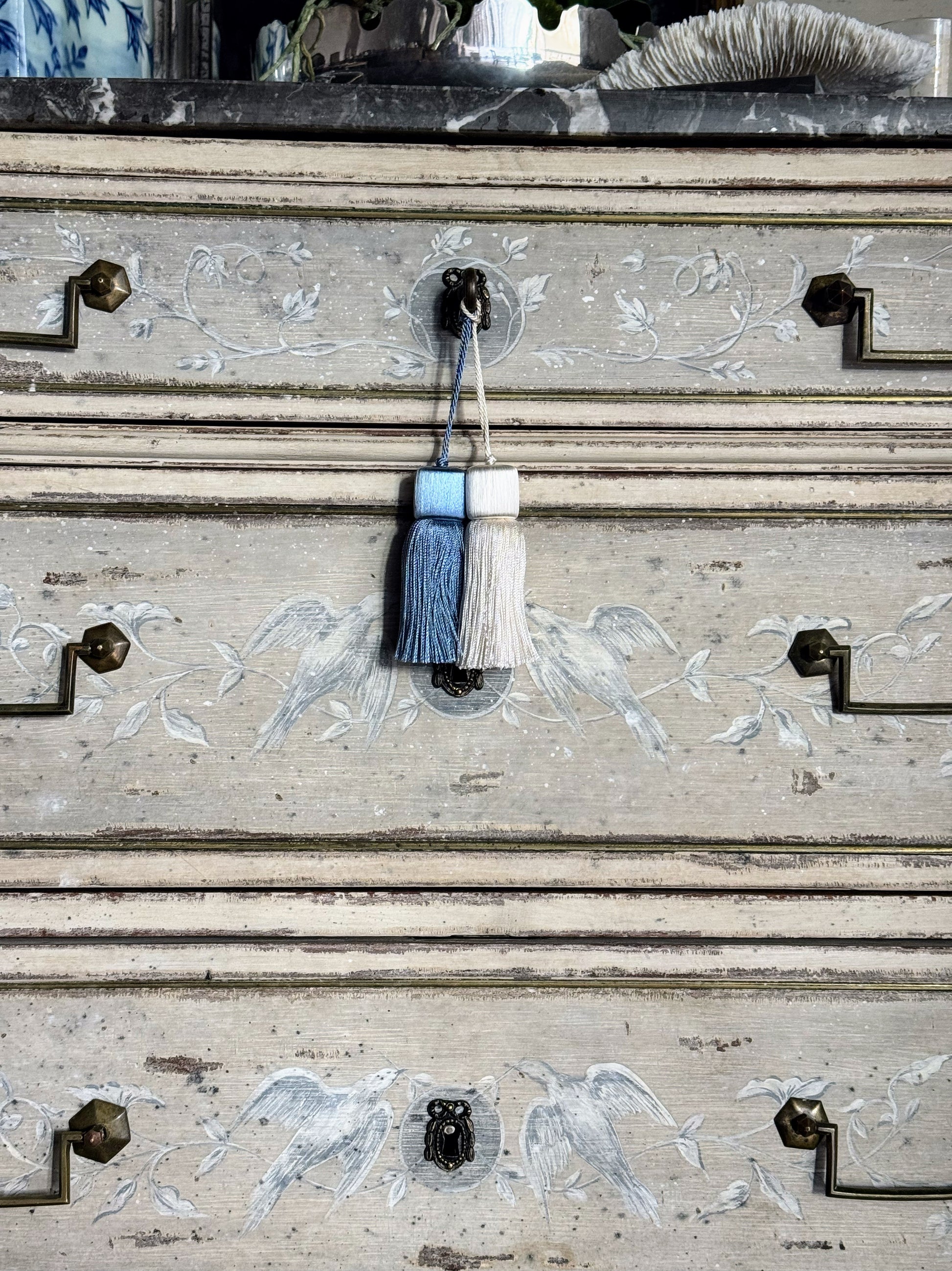 The body is painted in a soft neutral tone with delicate bird motifs drifting across the drawer fronts—an artistic detail that sets her apart. The black marble top adds contrast and depth, grounding the look and making it feel truly unique. Subtle gilded accents frame each drawer, lending just the right amount of shimmer to the otherwise matte finish.