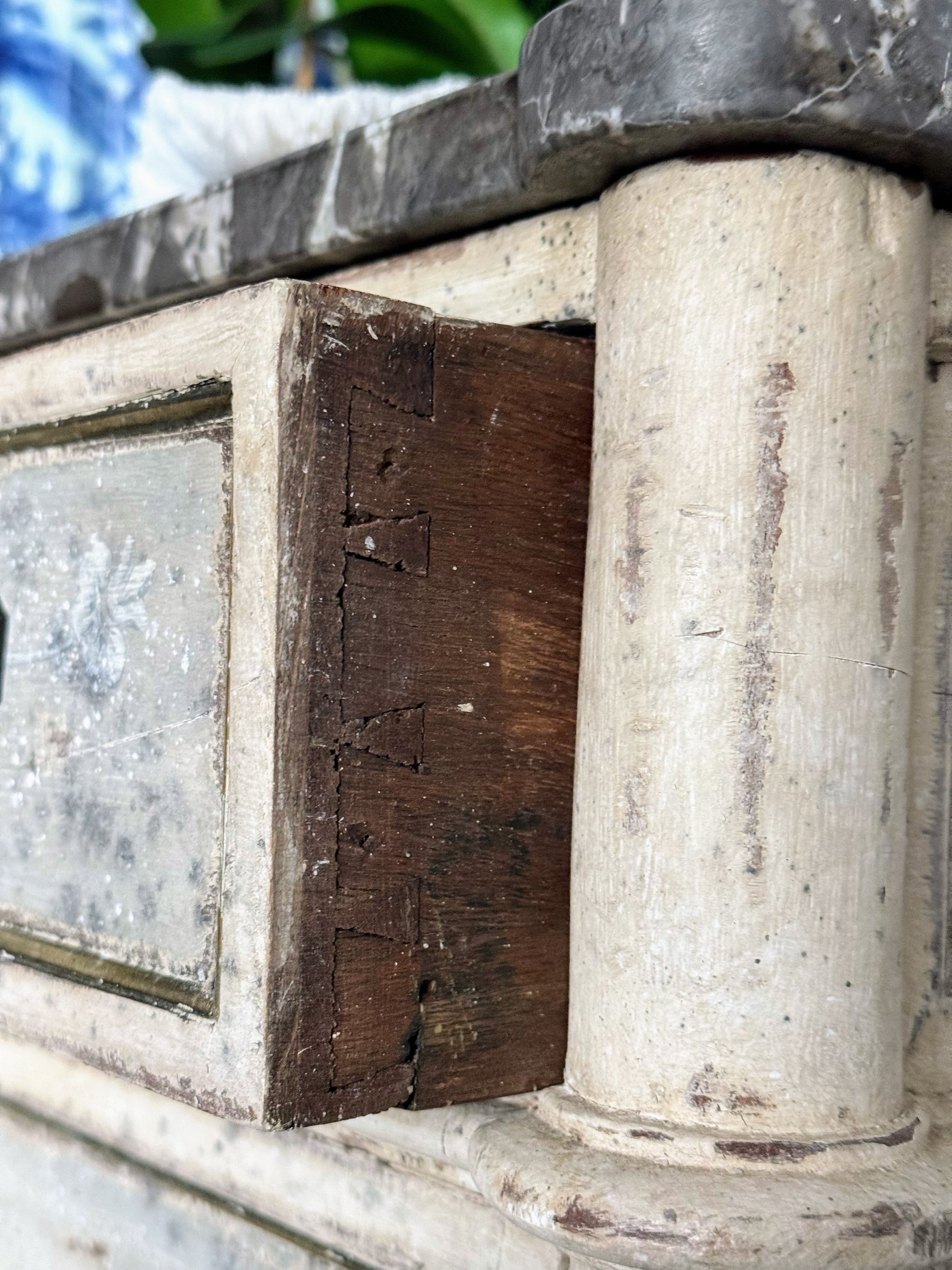 Hand sourced in France from some of my favorite vendors - this is one of the more incredible pieces I’ve come across in the last few containers! From the hand-painted birds to the rich marble top, every inch invites a closer look. She’s a statement piece—layered, romantic, and full of character!
