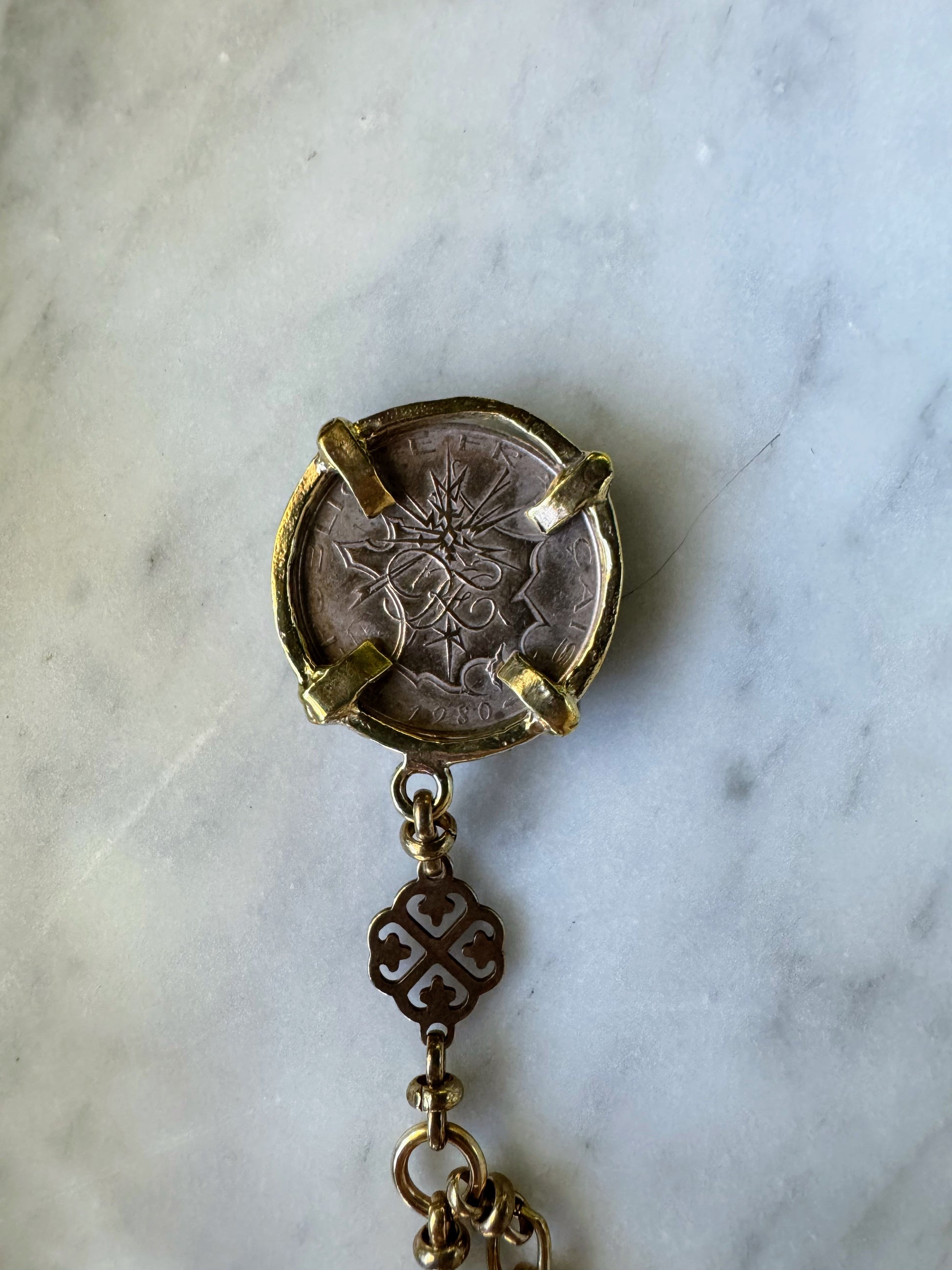 Bold and sculptural, this necklace features an authentic 1980 French 10 franc coin in a gold-toned finish. With its oversized profile and rich detail, the coin pairs beautifully with a vintage brass chain that’s weighty, warm, and full of character.